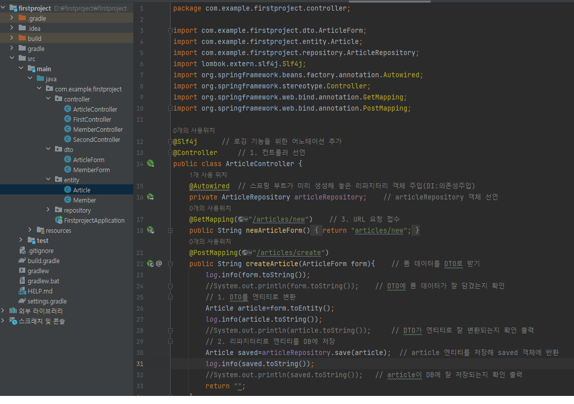 dto/ArticleForm.java에서 생성자 전체 삭제, @AllArgsConstructor 어노테이션 추가