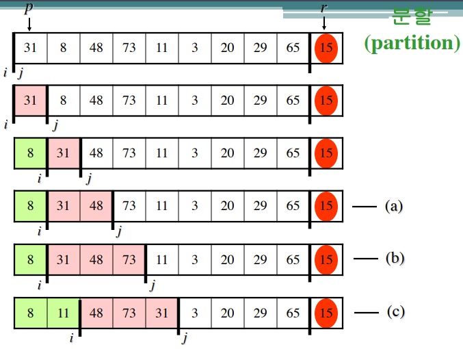 q = partition(A, p, r); // 분할