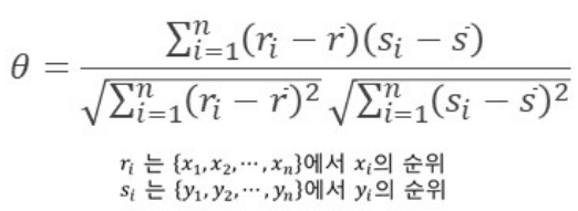 - 서열척도(등수를 갖고 있음)를 갖고 있는 두 변수들의 상관관계 측정