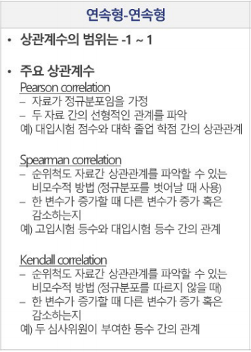 - 두 변수 간의 선형관계의 방향과 강도가 어느 정도인지 측정