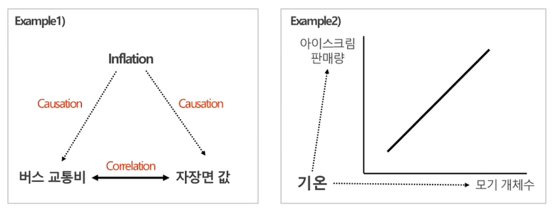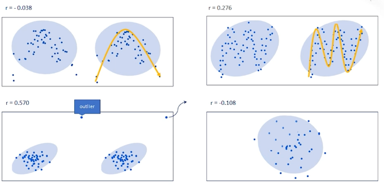 - 두 변수가 비선형관계이거나 우연히 상관관계가 높을 수 있어서 상관계수 절댓값이 1에 가까워도 상관관계가 높지 않을 수 있고, 0에 가까워도 상관관계가 없는건 아닐 수 있음