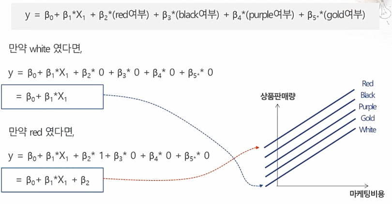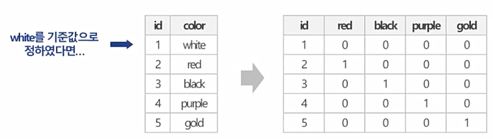 - 해당 범주형 변수의 기준값을 정함(drop_first 또는 drop_last와 같은 방법으로 정하기도함)