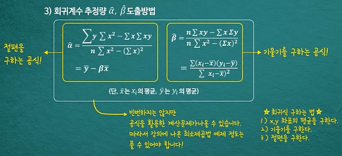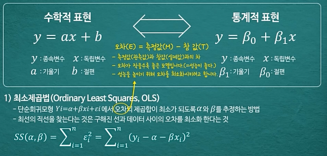 - 상관분석을 통해 두 변수 간에 의미있는 선형성이 있음을 알았지만 인과관계를 설명하는건 아니었음->회귀분석으로 인과관계 확인