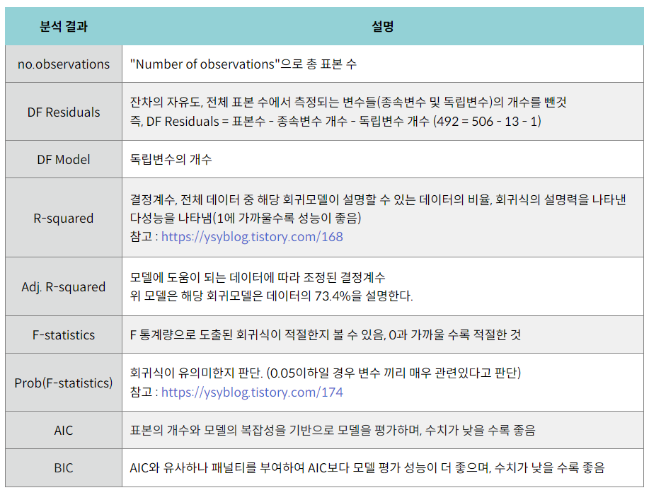 - 귀무가설 : x변수들은 y변수와 선형관계 없음(기울기=0)